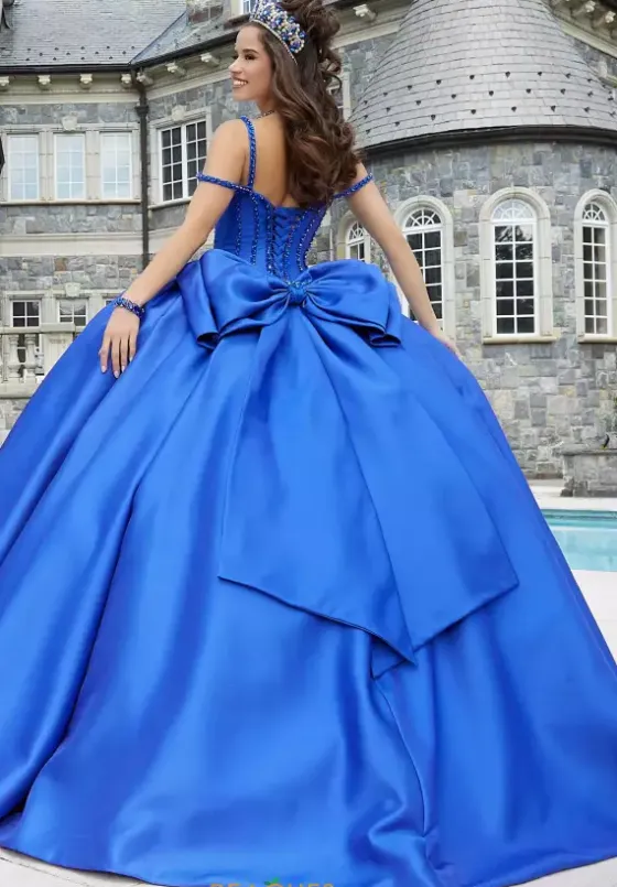 Traditional yet fashion forward, style 60173 by Vizcaya is a must have. The voluminous satin dress showcases a corset bodice with fully beaded corset boning and dainty beaded straps. The skirt of this dress is striking with a sweep train along with an oversized satin bow that sits beneath the adjustable lace up closure.