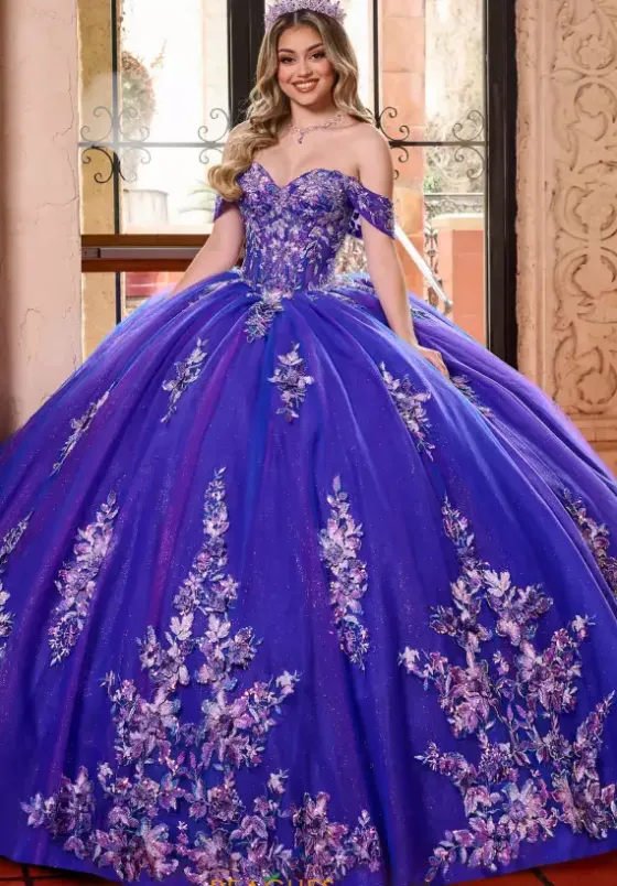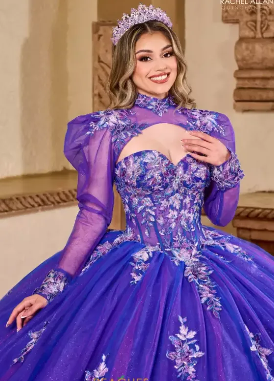 Feel like a true princess on your special day in this Rachel Allan Quince dress style RQ2200. The strapless off the shoulder cap sleeves bodice showcases a long sheer illusion waist with gorgeous sequins floral appliques adorning it. A detachable long sleeve top gives you a two in one look. The tulle layered ball gown skirt is adorned with those matching appliques from the bodice.