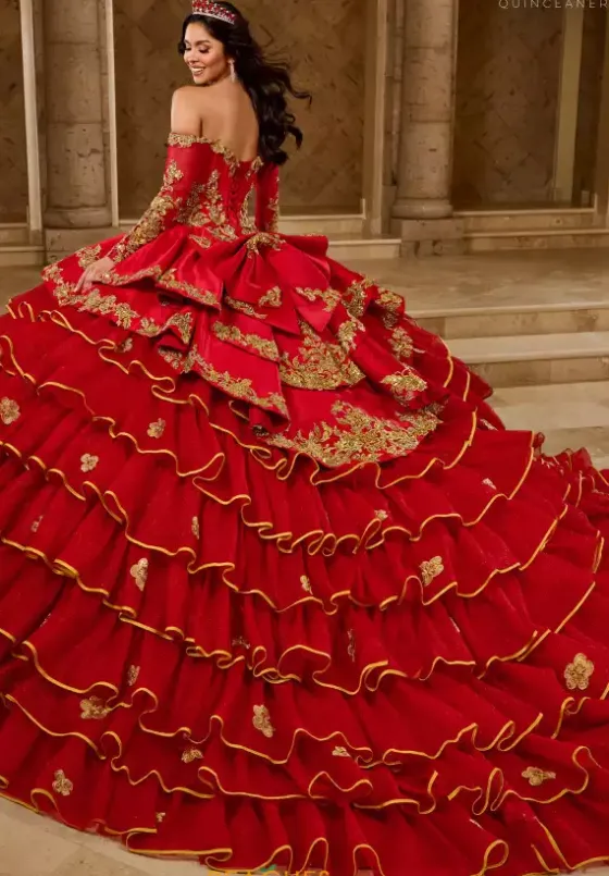 This Rachel Allan Quince dress is modern yet traditional all in one. Style RQ5012 is truly breathtaking. This off the shoulder long sleeve sweetheart neckline corset bodice is embellished with striking metallic appliques. The multi ruffled layer tulle is edged with metallic ribbon. The back has a detachable bow and gorgeous train.