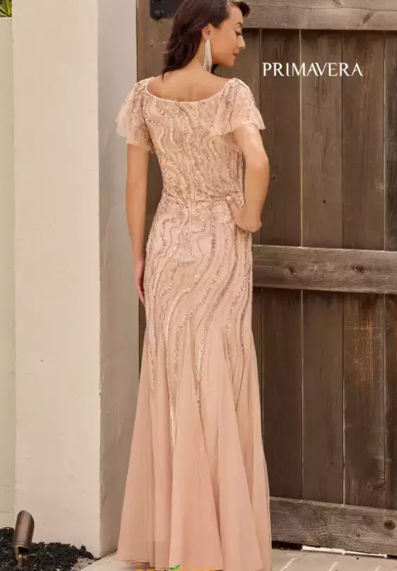 This gorgeous long dress by Primavera style 13155 exudes elegance. Featuring subtle amount of beading that adds a delicate amount of shimmer without being too overpowering and still giving you a beautiful shimmer. A formal cap sleeve offers a flattering and modest look, adding the perfect amount of elegance as well as coverage.