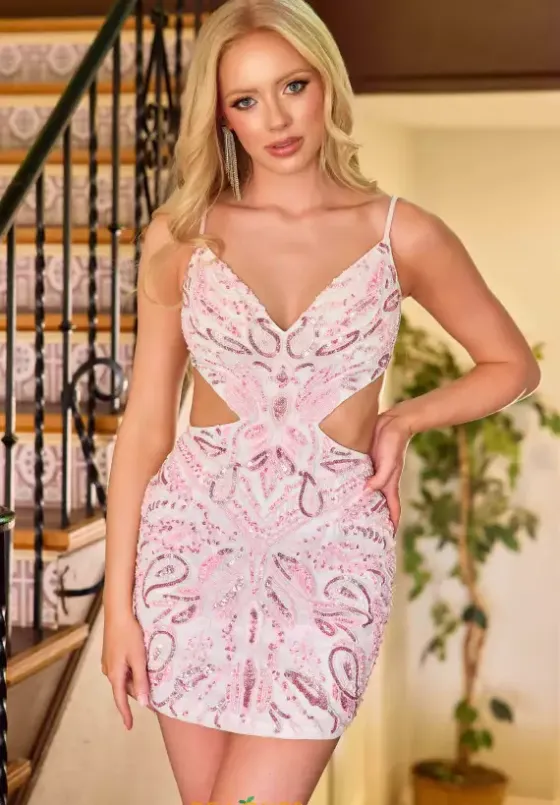Stand out at your next special event as you wear this stunning short fitted dress designed by Primavera, style 4412. Featuring a unique v neck neckline, cascading down to a bodice with ravishing side cut outs and a sexy open back with an appealing lace up for that extra support. The beadwork and sequin patterns guarantee this piece to be a wow factor.