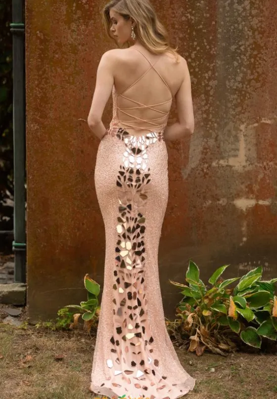 Show off your inner fashionista and rock this fully sequined Primavera dress 3616 for your prom. This fitted scoop neckline dress has thin straps that wrap over the shoulders and turn into an adjustable lace up back. A vertical row of scatter cut stones flow down the middle front of the dress and on the middle back as well.