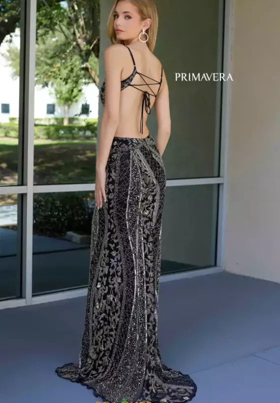 Have a dramatic entrance wearing this long fitted dress by Primavera, style 4308. Showcasing a plunging V neckline that follows into a corset lace up and flattering open back. Striking side cut outs on the bodice adds the perfect amount of fun and sexy to the dress. The slit and long train finish off this lovely look. This dress is adorned in glistening beadwork in lovely designs that’ll for sure have all eyes fall for you.
