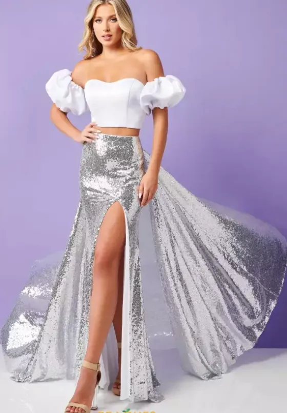 Be remembered at your next social occasion when you wear this glamorous long dress 70298 by Rachel Allan made in contrasting color shades. This shimmering 2 piece ensemble showcases a strapless satin crop top with a sweetheart neckline, lace up tie back and removable chic poof cap sleeves. The long slim skirt is made in a mini sequined fabric that sparkles beautifully and has a sexy high front side slit and dramatic train.