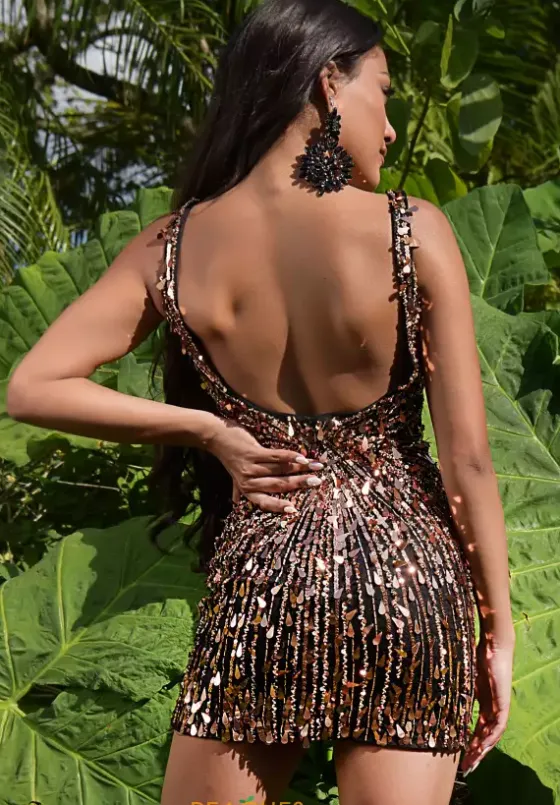 Strike a pose in this dazzling short fitted style 1706 from Jasz Couture, a perfect choice for homecoming. Fascinate the crowd in this fully beaded dress that highlights a deep v neckline and captivating open back. Shimmering beads and gleaming sequins adorn the entire silhouette showcasing an impeccable detailing that is perfection.