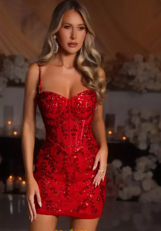 Feel beautiful and confident in this Portia and Scarlett short, style PS25707. This dress showcases a charming sweetheart neckline paired with beaded straps adding the sparkle to your night. Fully adorned with divine lace detailing paired with mesmerizing beadwork grabbing the attention of everyone as you pass them.
