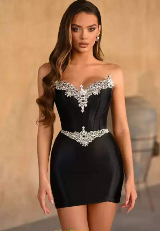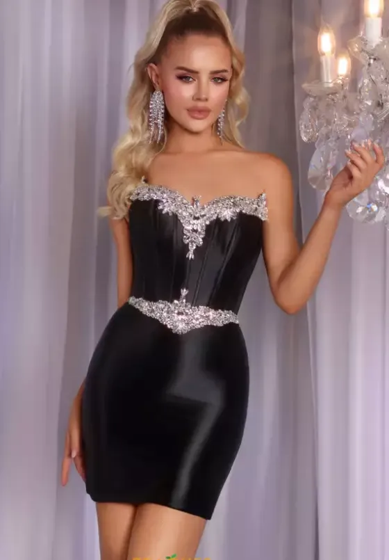 Be sleek and glamorous in this fitted short Portia and Scarlett dress style PS25741. This strapless dress features amazing rhinestone and gems along the bust of the corset inspired bodice. The waist is defined with those matching rhinestone beading and stretchy material to show off your hourglass figure.