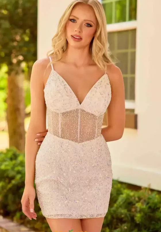 Show stopping short style 4450 by Primavera will leave everyone talking. The beaded illusion bodice is complimented with a v neckline and a corset lace tie back to naturally accentuate the waistline. The fitted skirt is embellished with trailing sequin to have you making your statement this coming season.