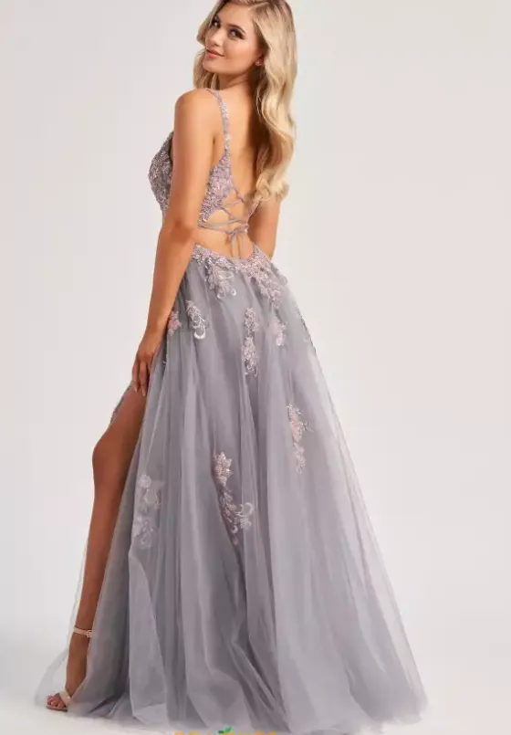 Stand out from the crowd in this lovely long A line dress by Colette, style CL8130. Featuring a captivating V neckline with adorned straps, and a corset bodice with a lace up that gives you a sexy open back. The bodice is adorned with intricate beadwork, sequins, embroidery, and applique detailing that cascade down the tulle skirt, which also has a thigh high slit that gives a sexy touch to this breathtaking look.