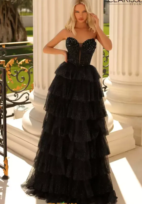 Step onto the red carpet wearing this gorgeous A-line dress that you can covert it into a short dress as well from Clarisse, style 811045. Showcasing a flawless strapless v- neckline corset top with a back zipper that will sure hug your body beautifully. The corset top is fully embellished with stunning beadwork. Featuring a unique ruffle bottom with a high sexy slit that’s made out of novelty and tulle material.