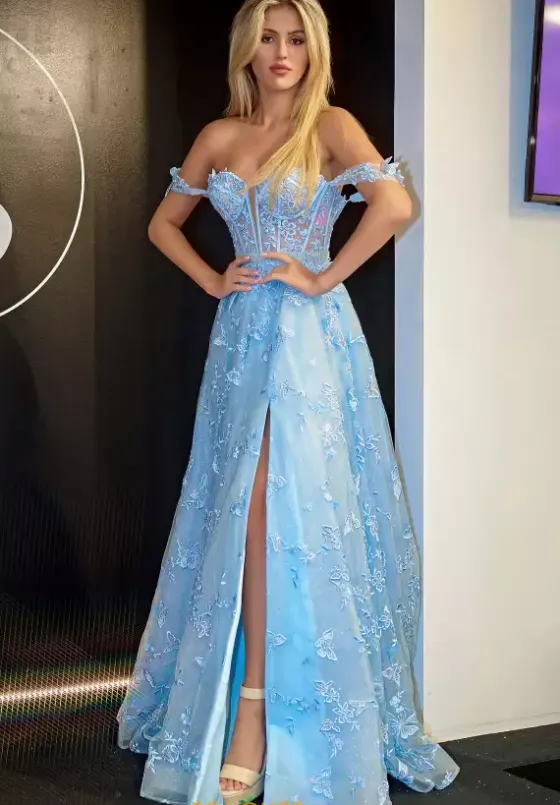Bring your inner princess to life with this glittering A-line prom dress PS24513X designed by Portia and Scarlett. The cinchable corset bodice flaunts a strapless sweetheart neckline that plunges to create the illusion of a longer torso. Dazzling floral appliques and embroidery adorn the corset and travel onto the voluminous skirt.