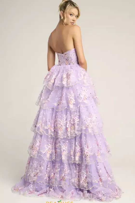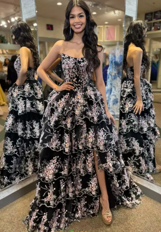 Hear the crowd gasp as you walk past in this long A line gown designed by Portia and Scarlett style, PS26051. Featuring a scoop strapless neckline with an appealing fitted corset, fully embellished in eye catching embroidery and stunning applique from top to bottom. Feel picture perfect ready with the sensational thigh high slit.