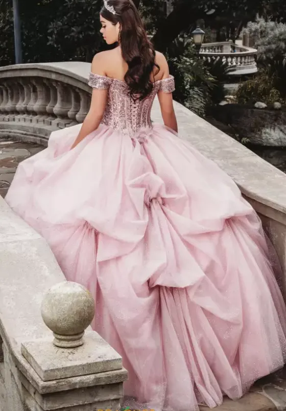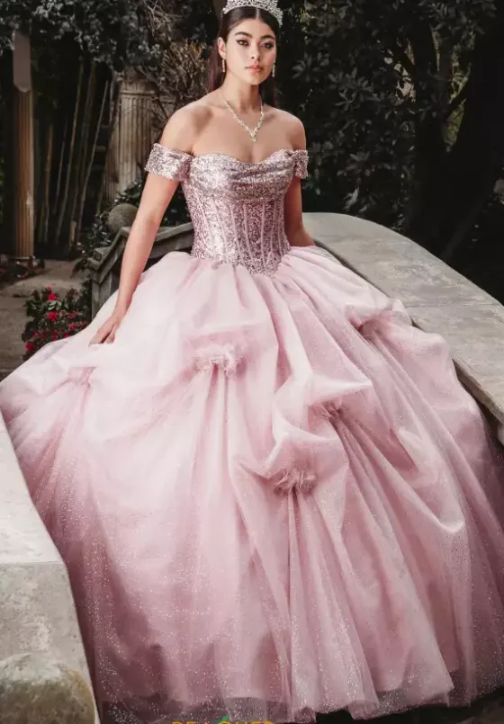 Captivating Amabella ballgown style Q1009 displays a glittering corset bodice completely embellished in sequin beading, with corset boning and ruching that compliments the scoop neckline complete with elegant off the shoulder cap sleeves. The stunning glitter tulle skirt uniquely stands out with ruffled embellishments that add flair. Detachable off the shoulder sleeves included.