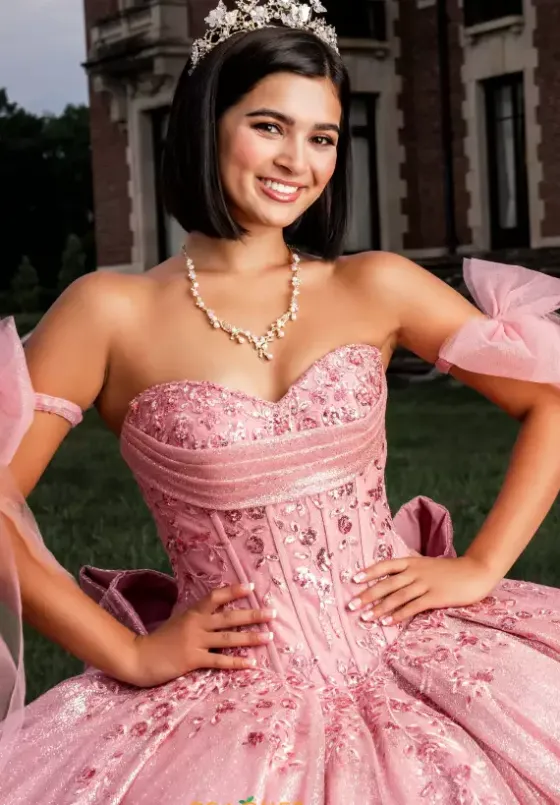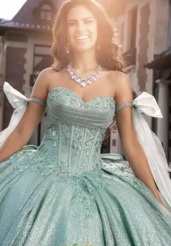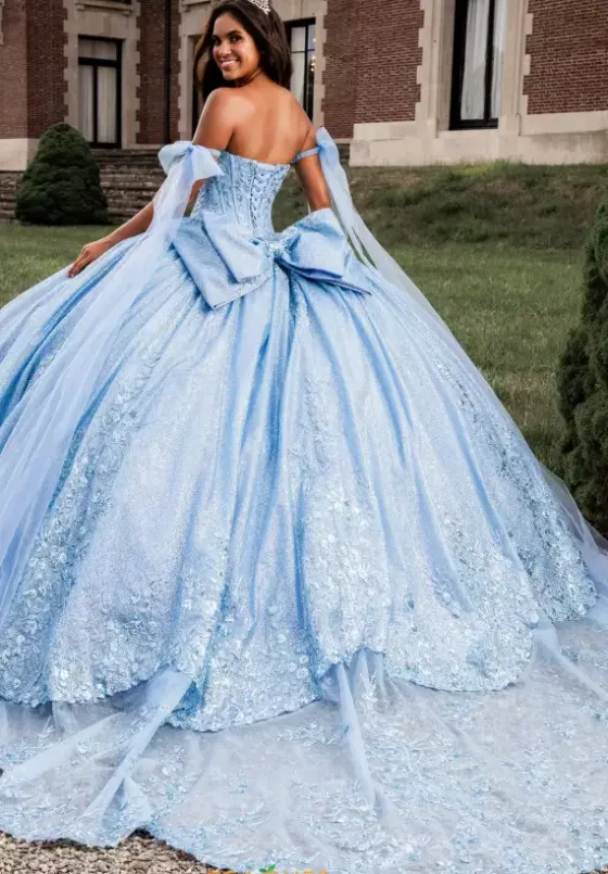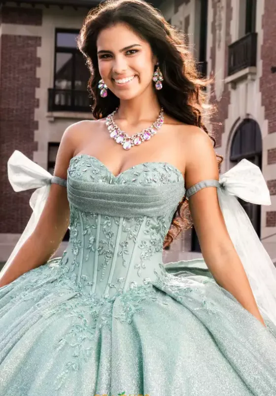Make lifelong memories in this enchanting ballgown by Amabella, style Q1023. This luxurious gown features a strapless sweetheart neckline with detachable off the shoulder cap sleeves, and a stunning corset bodice with lace up back that will accentuate your figure beautifully. Made with glitter tulle material, this dress is adorned with mesmerizing beadwork and includes a chic overskirt, a lovely train, and a bow that brings this glamorous look together.