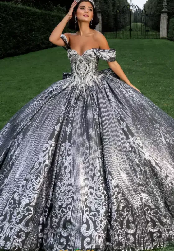 Make wonderful memories on your special day when you wear this lovely Amabella dress, style Q1037. This gorgeous ball gown features detachable sleeves and a charming off the shoulder sweetheart neckline. Made from glitter tulle material, this dress is adorned with phenomenal applique detailing and marvelous beadwork. With its eye catching bow and train, you will wish the night never ends.