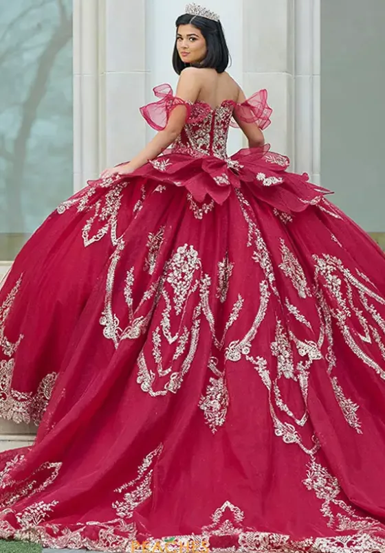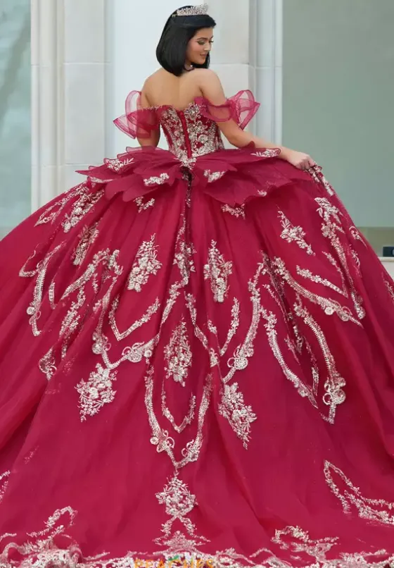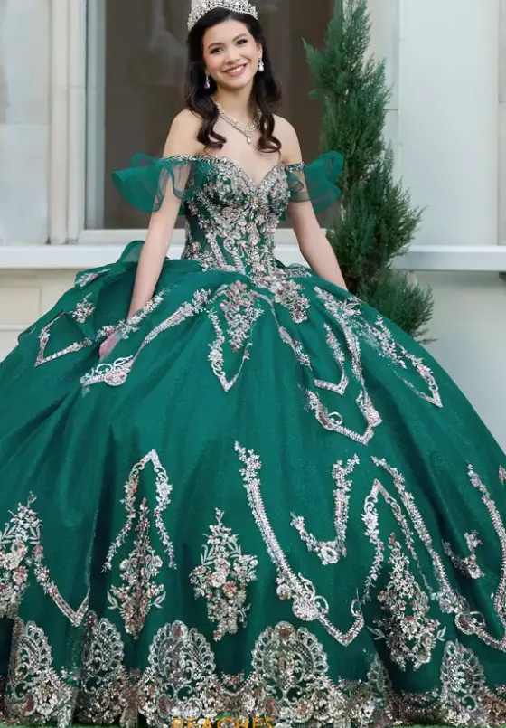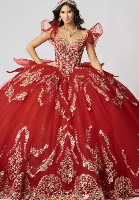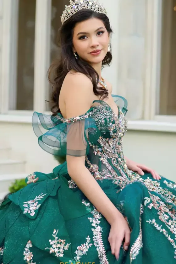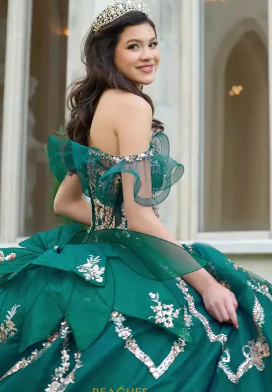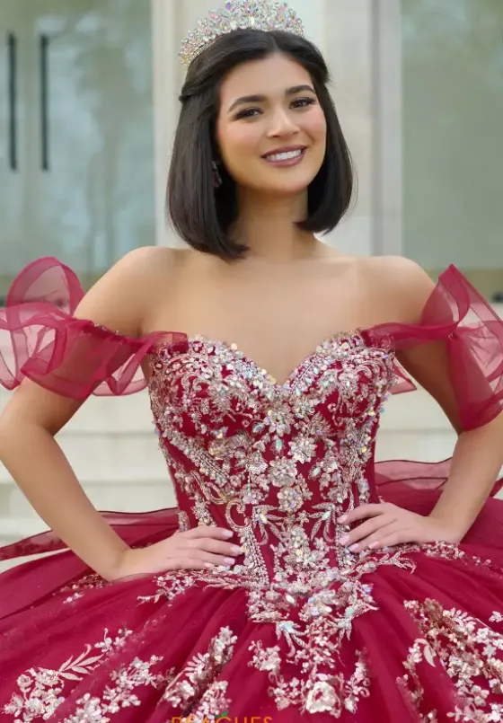 Have all eyes on you when wearing this Amabell dress, style Q1053. This ball gown features a charming off the shoulder sweetheart neckline with detachable sleeves. This gorgeous corset bodice is adorned with stunning beadwork. Made from sparkle tulle material, this dress has beautiful applique that will catch everyone’s eye. With this marvelous bow, this dress is truly breathtaking, especially with the train.