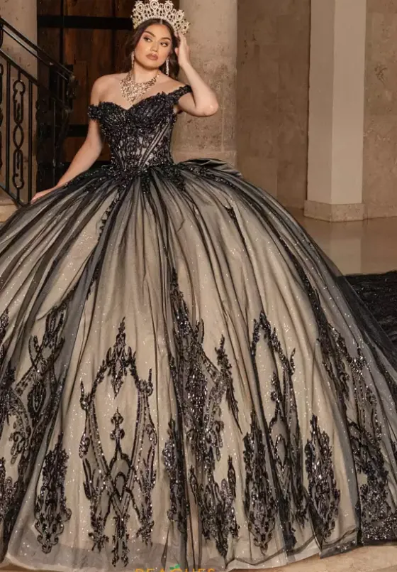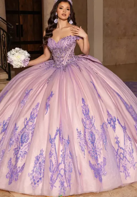 Be untouchable in this striking and glistening Rachel Allan Quince ball gown style RQ2247. Dazzling mixtures of beads, sequins, and appliques shimmer across the glittering tulle fabric of the adjustable corset bodice and dramatic cathedral style sweep train skirt. Intricate patterns decorate the hem and match the detachable bow.