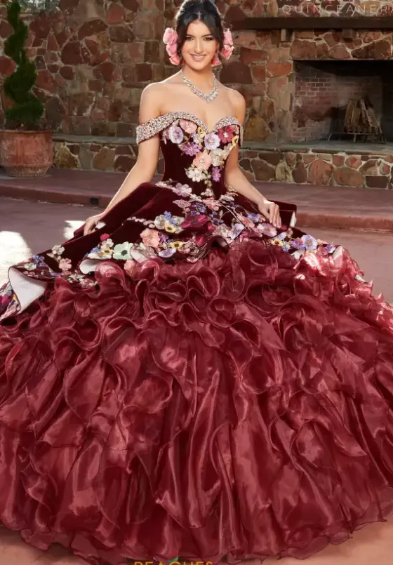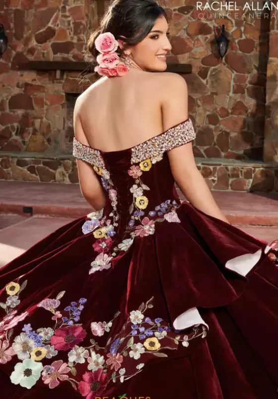 Turn all eyes into heart eyes when you step into the room wearing exquisite ball gown RQ3111 by Rachel Allan Quince. Available in deep regal colors, the multicolored floral appliques will make this astonishing dress pop. The off the shoulder cap sleeves are adorned in radiant beads and the ruffle tiered skirt has floral appliques at the hem of each layer drawing attention to the organza sweep train.
