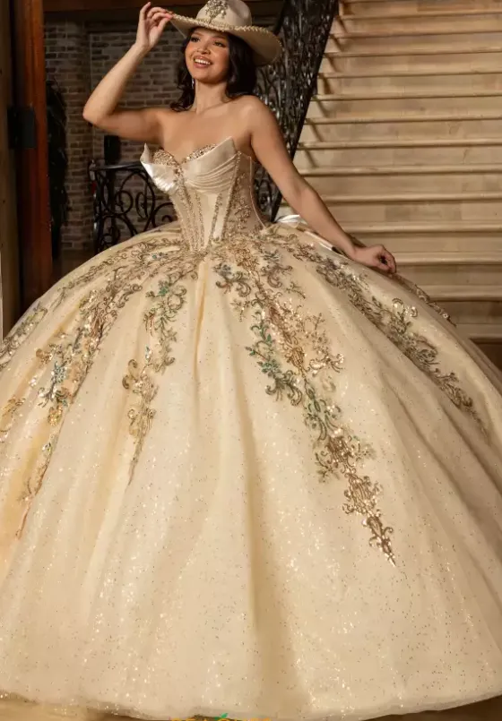 Look and feel as pretty as a princess in this princess styled Rachel Allan Quince ball gown style RQ3172. This sparkling voluminous satin gown includes a matching detachable cape that overlaps the shimmering applique embellished sweep train. The satin bodice has a traditional adjustable lace up closure.