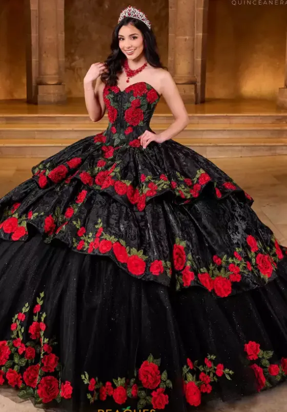 Make a fun fashion statement in this glamorous Rachel Allan quince RQ5006. Featuring a classy strapless sweetheart neckline with an adjustable lace up corset back for the perfect amount of comfort. Made with a 3 tier look and adorned with a stunning floral embroidery throughout the gown. A long train is added to complete the look.
