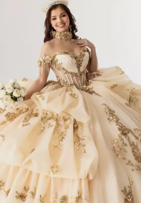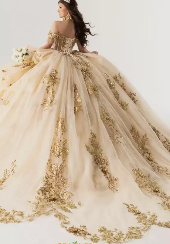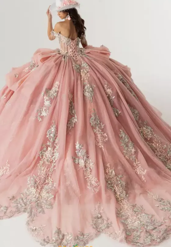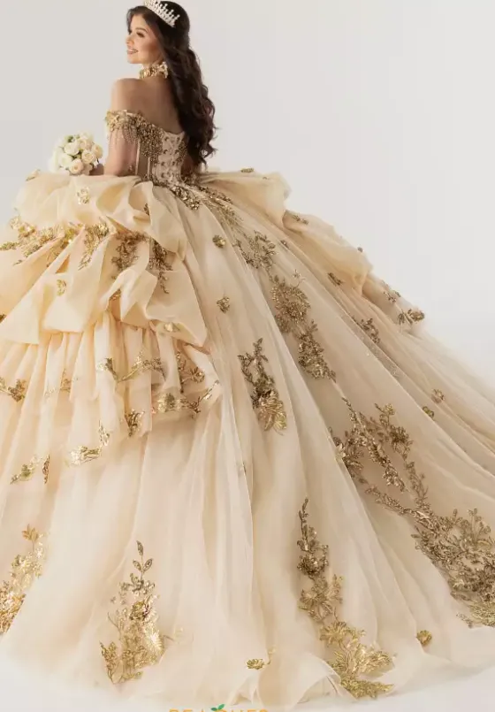 Make a statement this season in ball gown style RQ6014 by Rachel Allan Quince. The off the shoulder sweetheart neckline is paired with the lovely illusion bodice embellished with lace sequin applique and a delicate line of beaded fringe. Showcasing the multi tiered glittered tulle skirt embellished with applique meticulously along the trim of each layer and finishes with a delicate scalloped train.