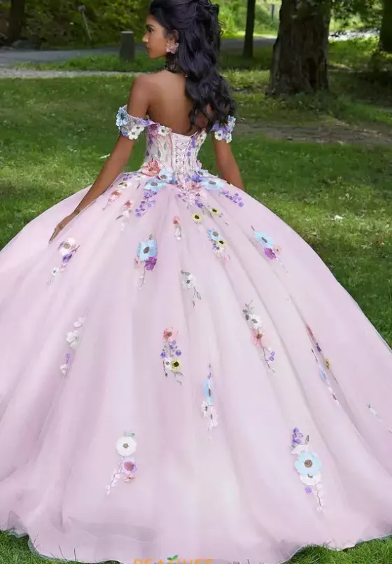 It’s all about the detail in this amazing Vizcaya ball gown quince dress 89446. The long waist corset style bodice has a scoop neckline and detachable off the shoulder cap sleeves. The bodice is adorn in multi color embroidered floral appliques. Those floral appliques are scattered throughout the tulle ball gown skirt. A matching stole included.