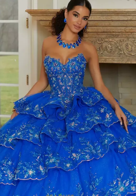 The perfect choice for your Quinceanera ballgown style 89476 by Vizcaya will have you dropping jaws. The strapless sweetheart neckline is complimented with detachable tiered off the shoulder sleeves. Showcasing the fully beaded bodice to complimented the matching beadwork along each layered tier. Highlighting the matching stole which is included.