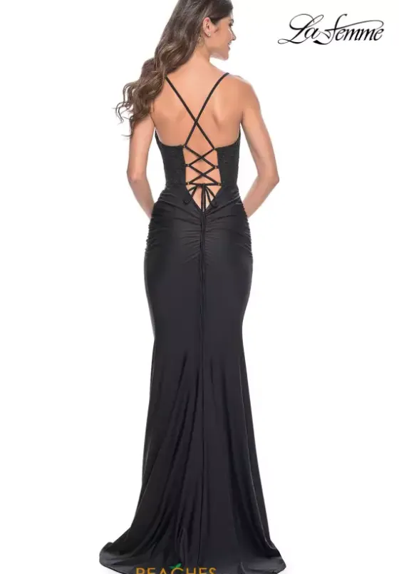 Fun and fabulous, this gorgeous La Femme dress 31857 is an ideal choice for your next social occasion. This breathtaking ensemble features a scoop neckline and dainty thin straps. The lace bodice accentuates your curves, while the lace up closure defines your hourglass silhouette. Made in a fitted jersey fabric, the long fitted skirt showcases an elegant sweep train.