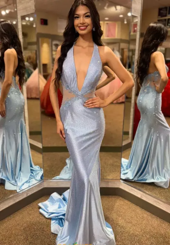 Make heads turn when wearing this long fitted dress by Sherri Hill, style 56997. Featuring a sexy plunging high halter v- neckline leading to an open back ending with a zipper closure. The top of this ensemble is a see through corset which will hug your bodice beautifully all night long, adorned with stunning floral lace applique. The bottom is made out of jersey material that’s fully embellished with glistening beadwork throughout the ensemble. You will for sure going to have all eyes on you.