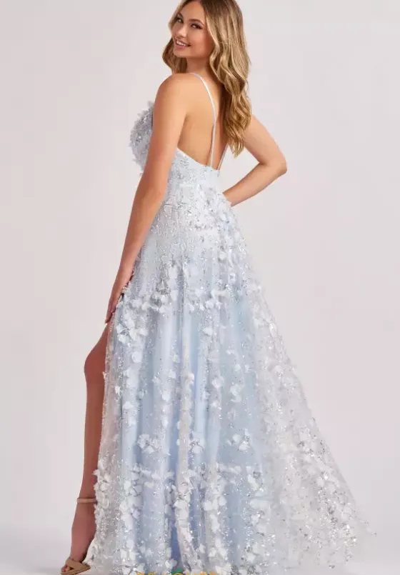 Live your fairy tale dream by wearing your dream dress from Colette style CL8525. This long A line dress showcases a plunging V-neckline and a pair of matching delicate thin straps. It is fully embellished my glistening sequins and embroidery floral details. The perfect final touches to you dream dress are the side pockets and the high thigh slit.
