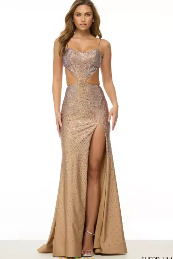 Look like a million bucks when wearing this long fitted jersey dress by Sherri Hill, style 57068. Showcasing a scoop neckline with delicate thin straps flowing to a sexy open corset lace up back and side cut outs ending with a back zipper closure and ruching. This ensemble is fully embellished with dazzling beadwork along the dress. For the perfect final touch it has a sexy high thigh slit and a classy train.