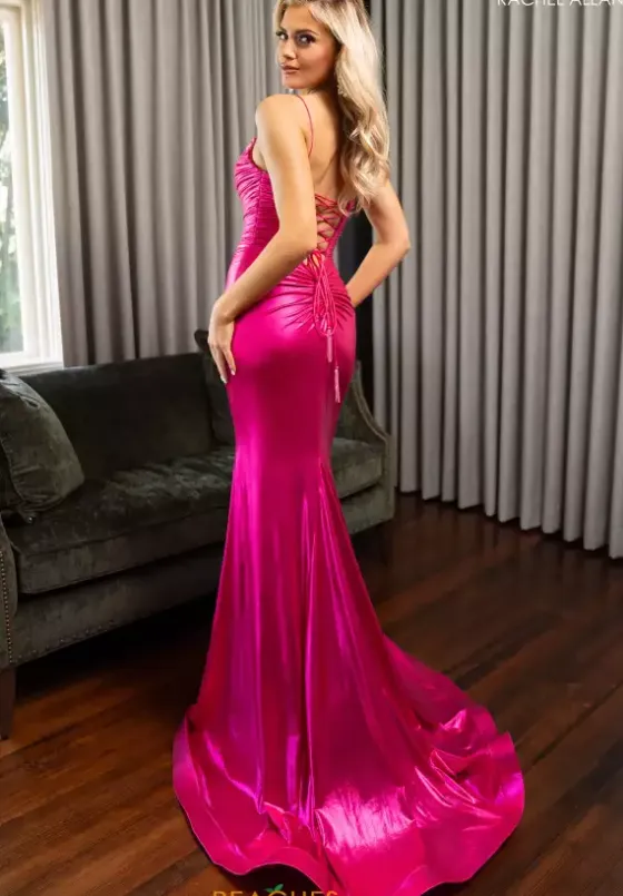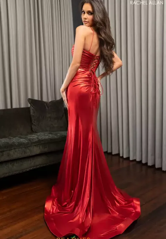 Standout from the rest of the girls when wearing this long fitted dress by Rachel Allan, style 70738. Showcasing a unique scoop neckline that’s adorned with bedazzled beadwork, leading to a sexy corset lace up back that will hug your bodice perfectly. Featuring a stunning bottom that’s made out of stretchy lining lame material with ruching in the back ending with a back zipper closure. For the perfect final touch it has a classy high thigh slit and a sweep train.