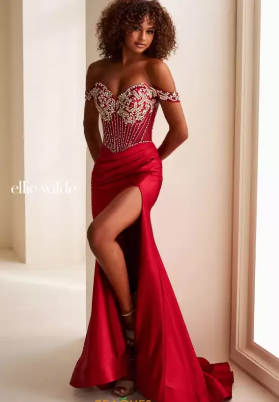 Be the talk of the night when you step in wearing this Ellie Wilde dress, style EW37016. This stunning gown features a strapless sweetheart neckline with detachable off the shoulder straps and a bedazzled corset bodice. Subtle side ruching flatters the figure as the skirt flows elegantly, finished with a thigh high slit and a dramatic train for the perfect final touch.