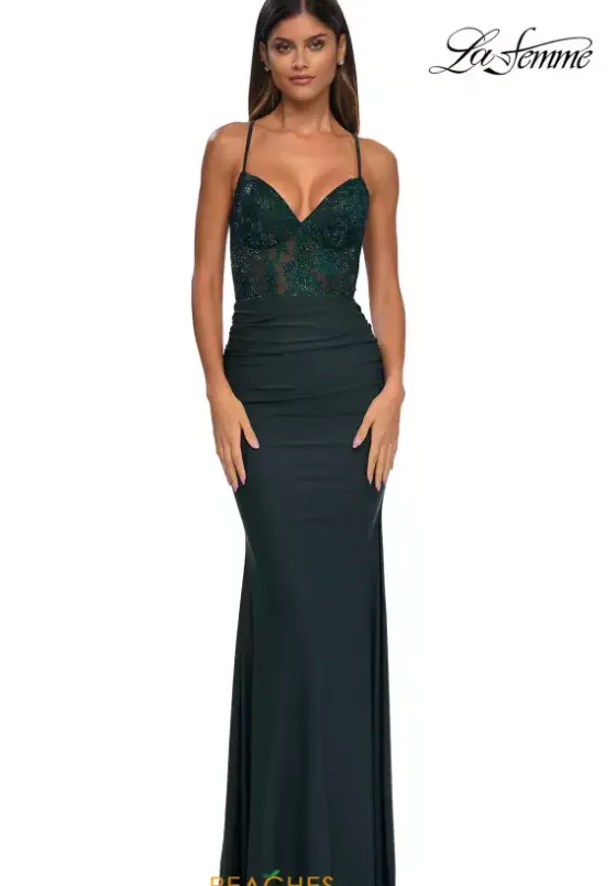 Experience an enchanting night in this precious long fitted dress by La Femme, style 32217. Showcasing a beaded and lace V neckline and sheer corset with an absolute must have corset lace up. The jersey material skirt hugs your body beautifully and flows down into a gorgeous long train. You will for sure going to have all eyes on you.