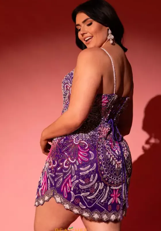 We are loving this one of a kind look 40080 by Rachel Allan. This beautiful boho chic style showcases spaghetti straps and a scalloped scoop neckline. The fitted sheath silhouette will hug your figure nicely and is embellished with an intricate bead pattern. Short skirt falls about mid thigh in length and is finished with a unique scalloped hemline. Flirty open back is supported by an adjustable lace up strap.