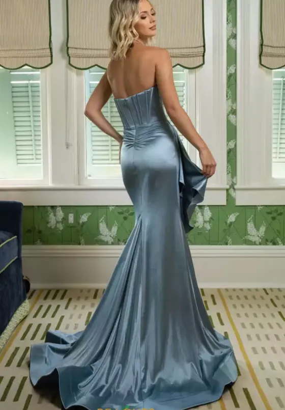 We are just in love with this illusion Rachel Allan two piece dress style 71061. The corset inspired bodice has a strapless scoop neckline and boning. The key hole peek a boo opening in front gives it that mocked two piece look with a side ruched skirt. Sprinkles of rhinestone beading highlight the dress.