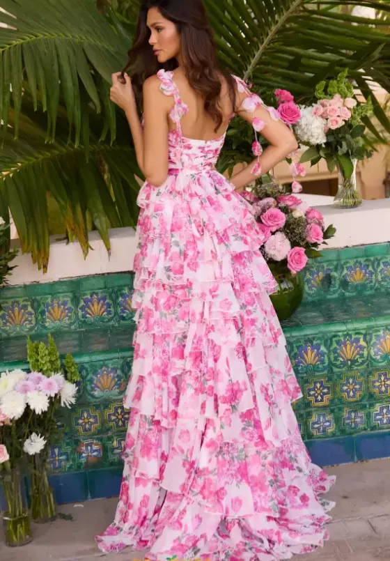 Make a jaw dropping appearance at your next special event in this floral print a line gown by Ava Presley 42332. This chiffon gown showcases a v cut neckline with dainty straps that are given a dangling floral design. This gorgeous gown is adorned in a stunning floral print that will have you stand our from the rest.