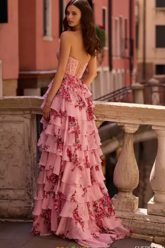 Indulge yourself in this captivating pink print Sherri Hill prom dress style 57569 for your next event. The strapless sweetheart corset bodice shimmers with lightly scattered hot stone beads on top of floral lace fabric. The floral printed skirt exudes romance with a sweep train and thigh high slit.