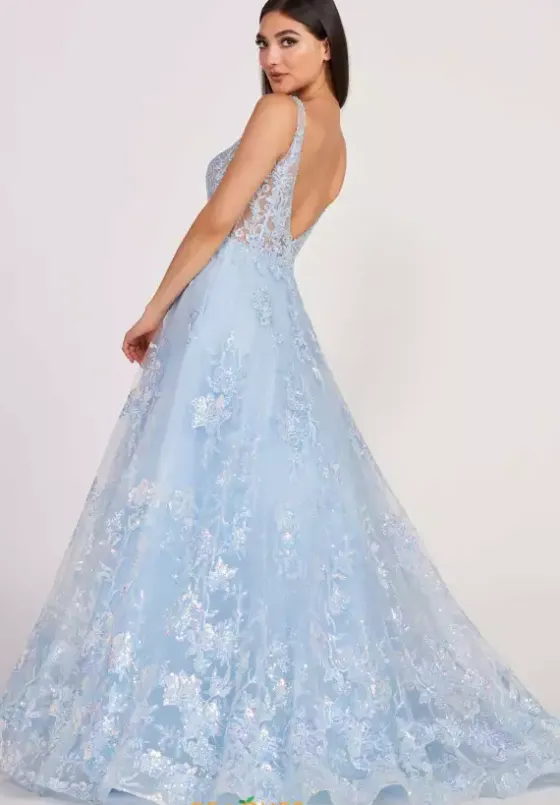 Dance the night away in this exquisite long dress EW34105 by Ellie Wilde. Show stopping a line dress features a plunging neckline. Sheer corset bodice is delicately adorned with beautiful embroidery that trickles onto the top of the full, glitter tulle skirt. Enchanting a line dress includes must have pockets.