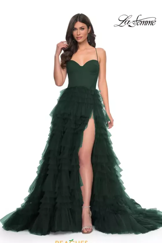 You will attract all attention when you make your entrance wearing this captivating La Femme A-line 32071. Available in dark colors, this dress appears ultra flattering and consists of the traditional adjustable fitted corset bodice that contours the small of your waist to be enhanced by the notable ruffle tiered tulle skirt completed with a thigh high slit and immense sweep train.