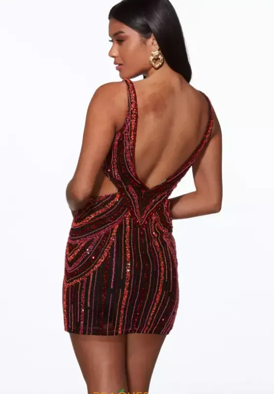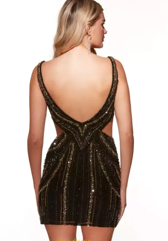 Get noticed at your next social occasion in this Alyce Paris short dress style embellished with dazzling lines of contrasting bead work. This scintillating silhouette features a fitted bodice with a deep V neckline, side cut outs, low back and thick straps. The short slim skirt will show off your legs beautifully.