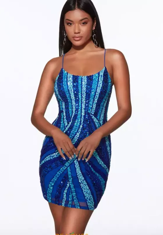 Make a bold fashion statement in this fun short fitted dress by Alyce style 40013. Showcasing a modest scoop neckline paired with thin supportive straps that create an open adjustable lace up back to give you a flattering fit that will hug your curves and accentuate you figure. The stunning beadwork is made into a unique pattern that will certainly have you stand out from the rest.