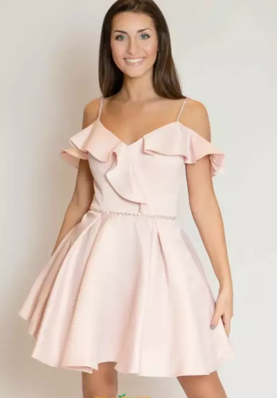 Strike a pose in this dazzling short dress 9536 by Morilee. Showcasing an exceptional off the shoulder ruffled neckline and beautifully beaded straps. Made with satin, this a line silhouette will give you the most flattering and charismatic appearance. A beaded belt at the waist brings this look together seductively.