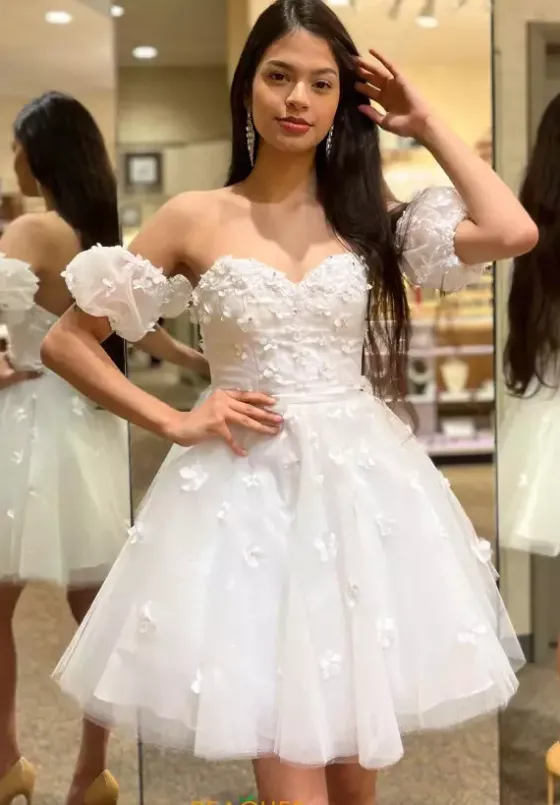 Beautiful short dress 9581 by Morilee is a must have. This strapless sweetheart neckline dress showcases a three dimensional floral detail that trims the neckline of the top. The back clasp together giving you a key hole opening. Detachable off the shoulder cap sleeves give you a two in one look. Sparkling glitter tulle make the skirt flare out just perfectly.
