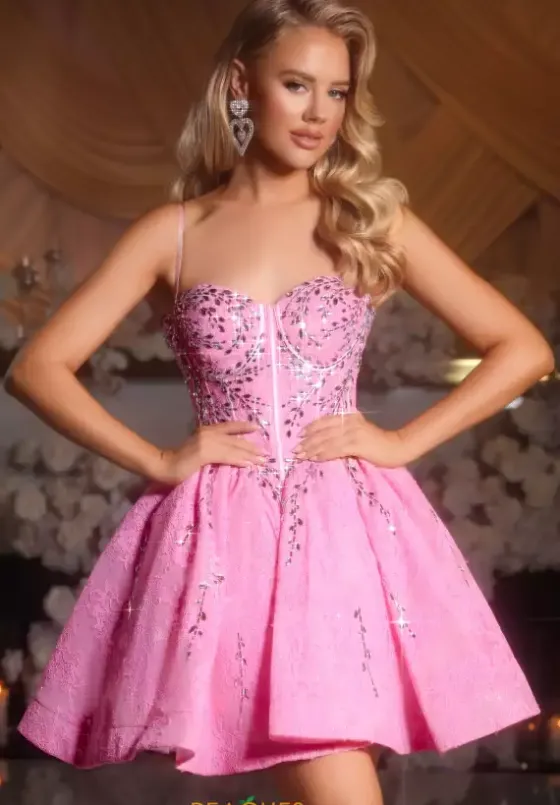 Glisten and shimmer from every angle in the illuminating Portia and Scarlett A-line dress, style PS25784. This stunning gown features a strapless sweetheart neckline adorned with beautiful gems embroidered throughout the dress. A full tulle skirt completes the look, adding a fun, princess-like feel.