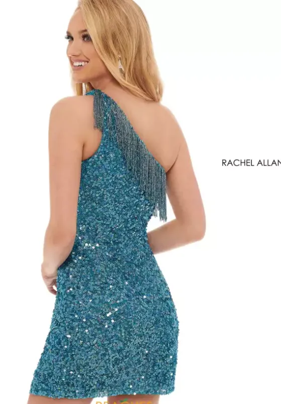 This vibrant Rachel Allan short dress 40150 is the perfect fashion piece for your special event. Made in bright colors, this style is fully embellished with dazzling sequins that will shine from every angle. The asymmetrical neckline is adorned with alluring hanging fringe. See more dresses with fringe at Peaches Boutique.