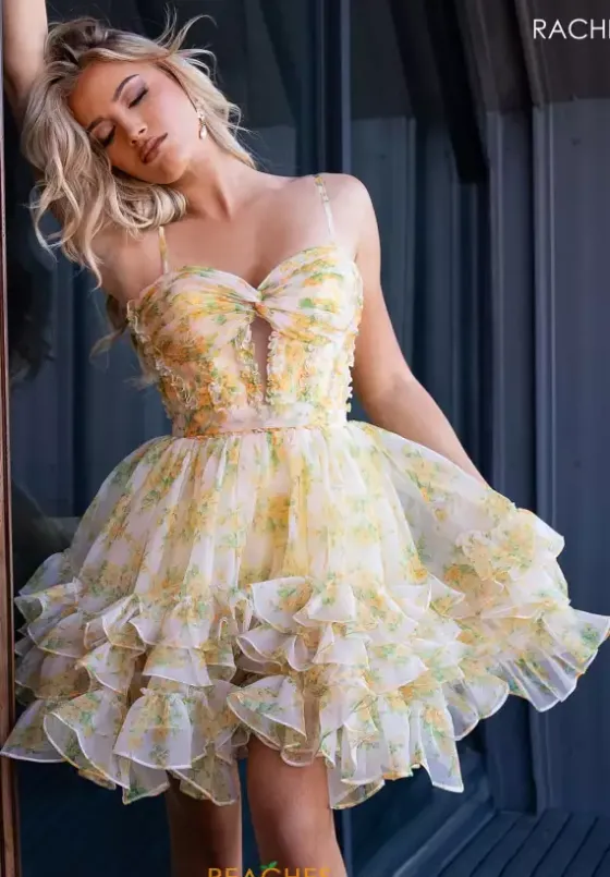 Feel like a princess in this enchanting short dress by Rachel Allan, 40490. Made of lightweight organza fabric with floral print, this dress is featuring a sweetheart neckline and thin dainty straps that give a classy and sophisticated look. The bodice of this dress has a mesh cut out in the center that adds a fun touch to the ensemble. The skirt has beautiful ruffles at the end that give it an airy and delicate look while also giving the dress an exquisite a-line silhouette. This dress is sure to have you feeling like beautiful all night long.