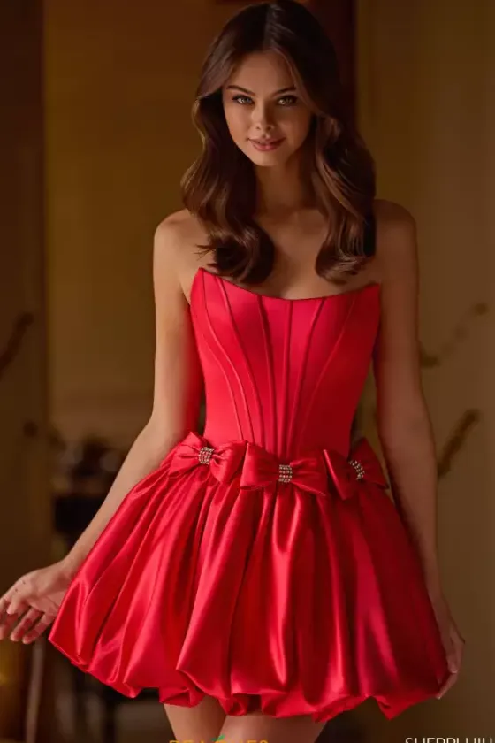 Make a statement at your homecoming dance wearing this stunning Sherri Hill short dress style 57307 made in exhilarating shades of satin. This stellar silhouette showcases a strapless corset bodice with a scoop neckline, exposed boning and a low zipper back. The waist is embellished with sparkly bows all the way around. The short, a line skirt has a bubble hem for extra flare.
