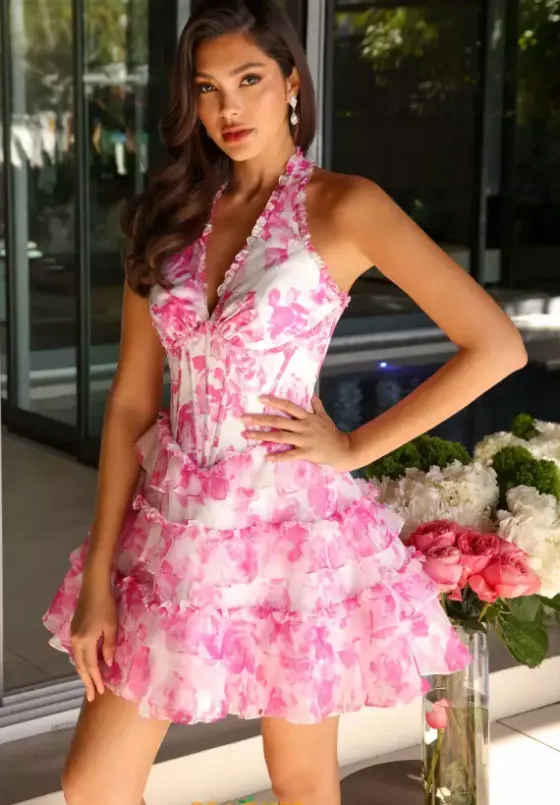 Be one of a kind wearing this unique floral patterned dress by Ava Presley, style 26446. This short A Line dress features a flattering halter V neck that goes into a corset that will accentuate your waist beautifully. The corset then goes into a layered chiffon skirt for a divine and comfortable feel.