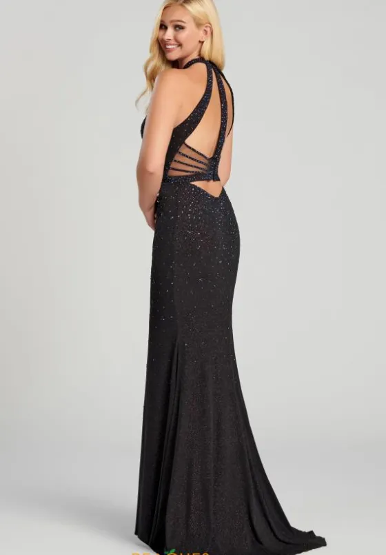 Make a glam fashion statement and rock this fitted beaded style EW120035 by Ellie Wilde to your senior prom. Made in shimmer jersey fabric and completely embellished with iridescent stones, this glistening gown features a high neck with sheer insets at the neckline and midriff with a cut out back. The long slim fitting skirt has a sweep train. See more phenomenal Ellie Wilde styles at Peaches Boutique in Chicago.